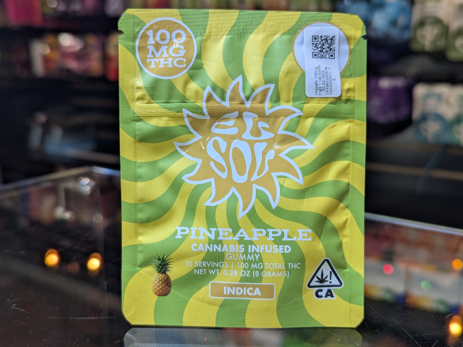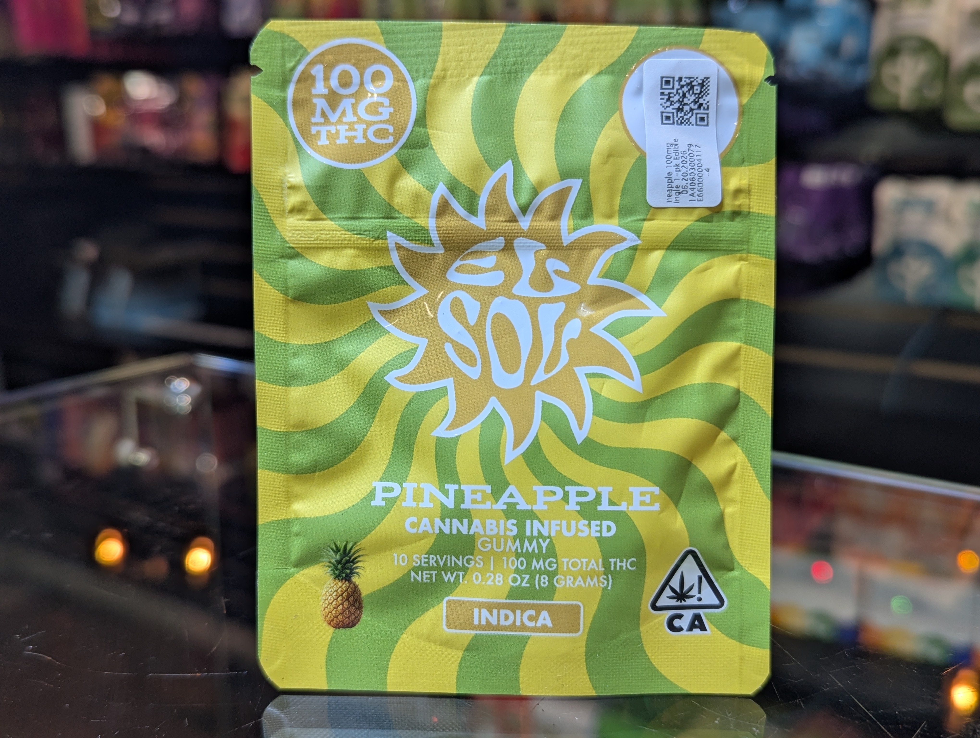 El Sol Pineapple 100mg single 1-pk Edible $6.95 Product Strain Pineapple Product Type Edibles Quantity on Hand 10 Product brand El Sol Package UID 1A4060300079E66000004117 Last Inventory Count Date Mon, 12/01/2025 - 12:24 PM Expiration Date 06/20/2026 NOTE: WE ONLY ACCEPT CASH